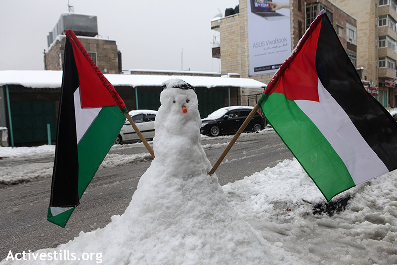 it snowed today in bethlehem and maybe all of palestine, snow that didn’t melt away right way. this also meant transportation was out. anne and i went for a walk, to the checkpoint near us in bethlehem and to al wallaje. i’m posting her post (the snowman at the apartheid wall was made-over by me :))